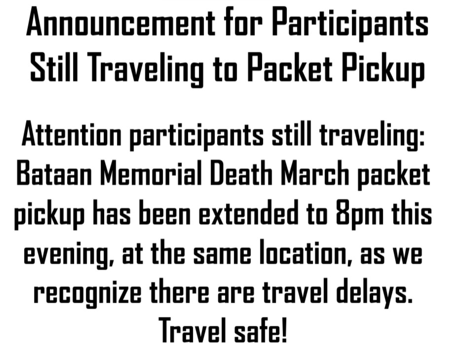 For the heavy category, we would like to encourage you to bring beans, rice, non perishable items, cans, macaroni, pasta, cat/dog food to use as weight in your backpack. Clear tape MUST be used when wrapping food items for weight, food cannot be wrapped with Duck Tape, Gorilla Tape, Electrical Tape, etc. At the conclusion for the march, you can drop your items in the bin and it will be donated to the local Food Bank. For those of you traveling, you may buy these items at the White Sands Commissary, AAFES, or local grocery stores once you arrive. No need to pack extra weight in your suitcases. You may not pack logs, water, rocks, sand, or anything that can be replenished along the route (unless the bags are sealed to the satisfaction of march officials). Each backpack will be inspected at the finish line upon completion of the march.