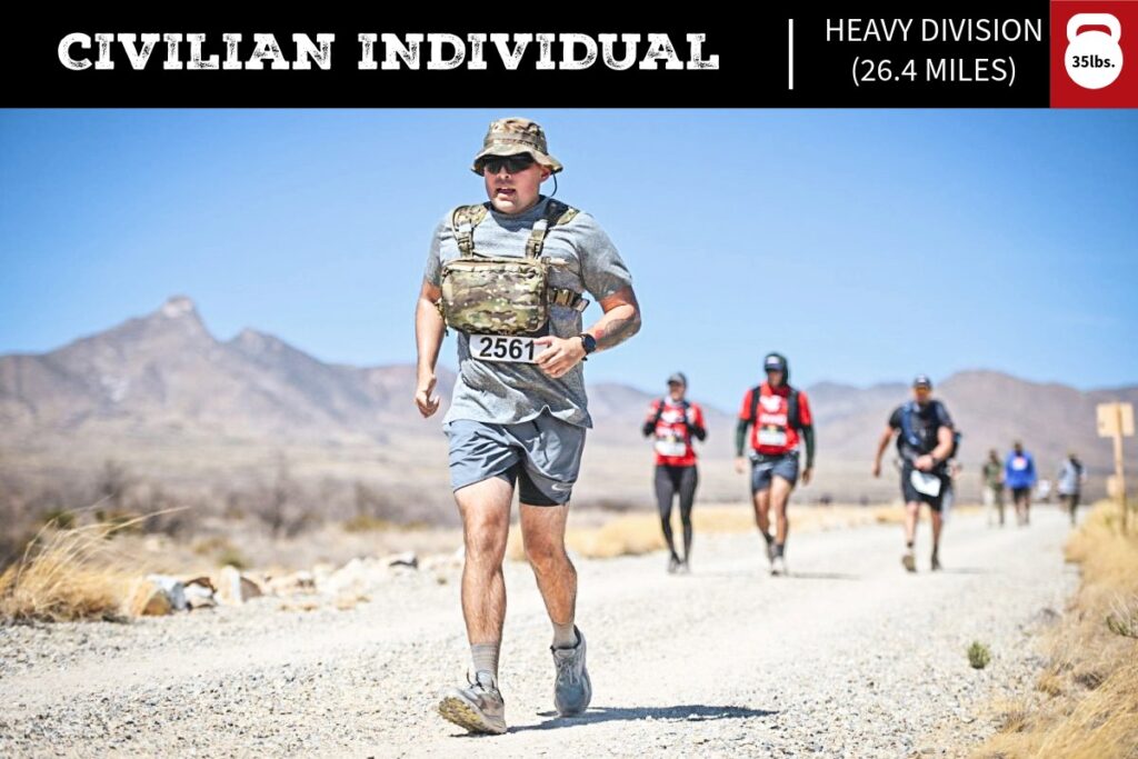 If entered into a light division, participants are not required to carry a 35-pound pack during the march. If entered into a heavy division participants are required to carry a 35-pound pack during the march. If a team is registered in a heavy division, all team members must comply to the 35-pound pack rule.